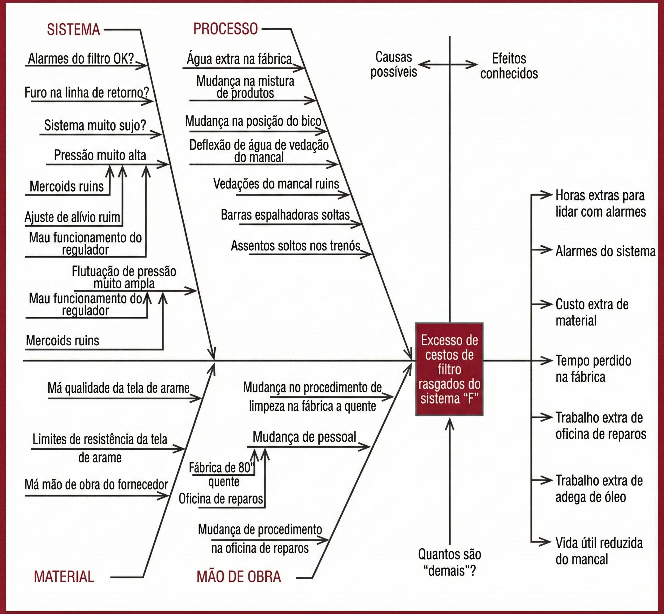 Exemplo de um diagrama de Ishikawa de falhas no cesto do filtro do sistema de óleo lubrificante.