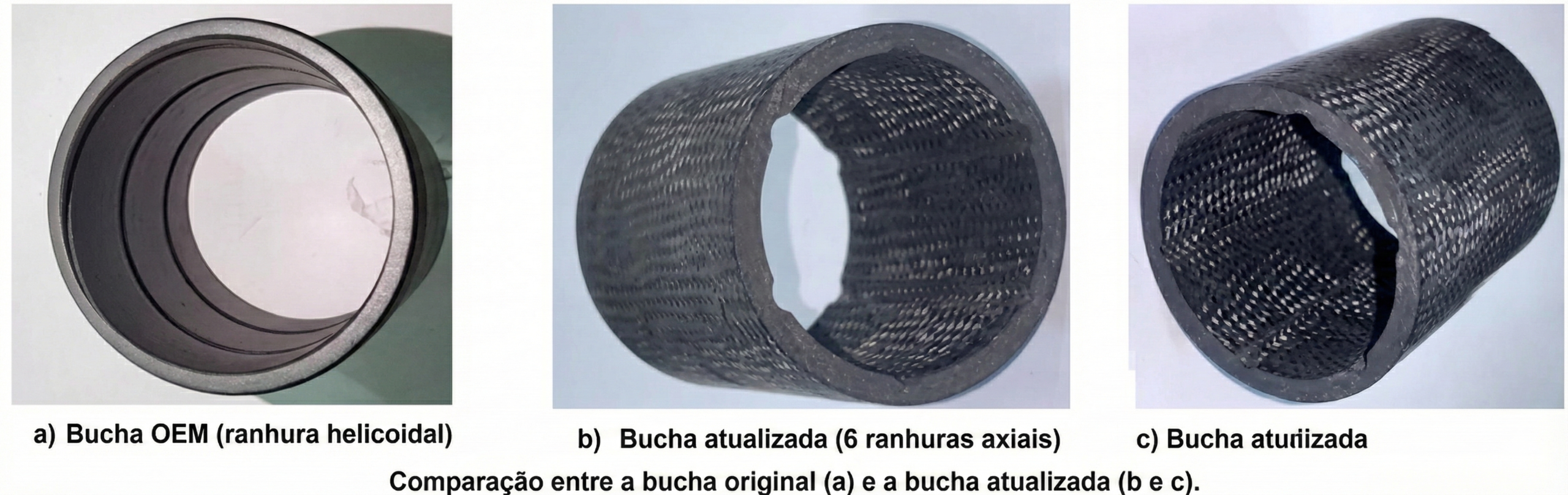 1. Novas Buchas As buchas do OEM tinham uma única ranhura helicoidal e eram feitas de PEEK — inadequadas tanto para a carga quanto para o ambiente abrasivo.