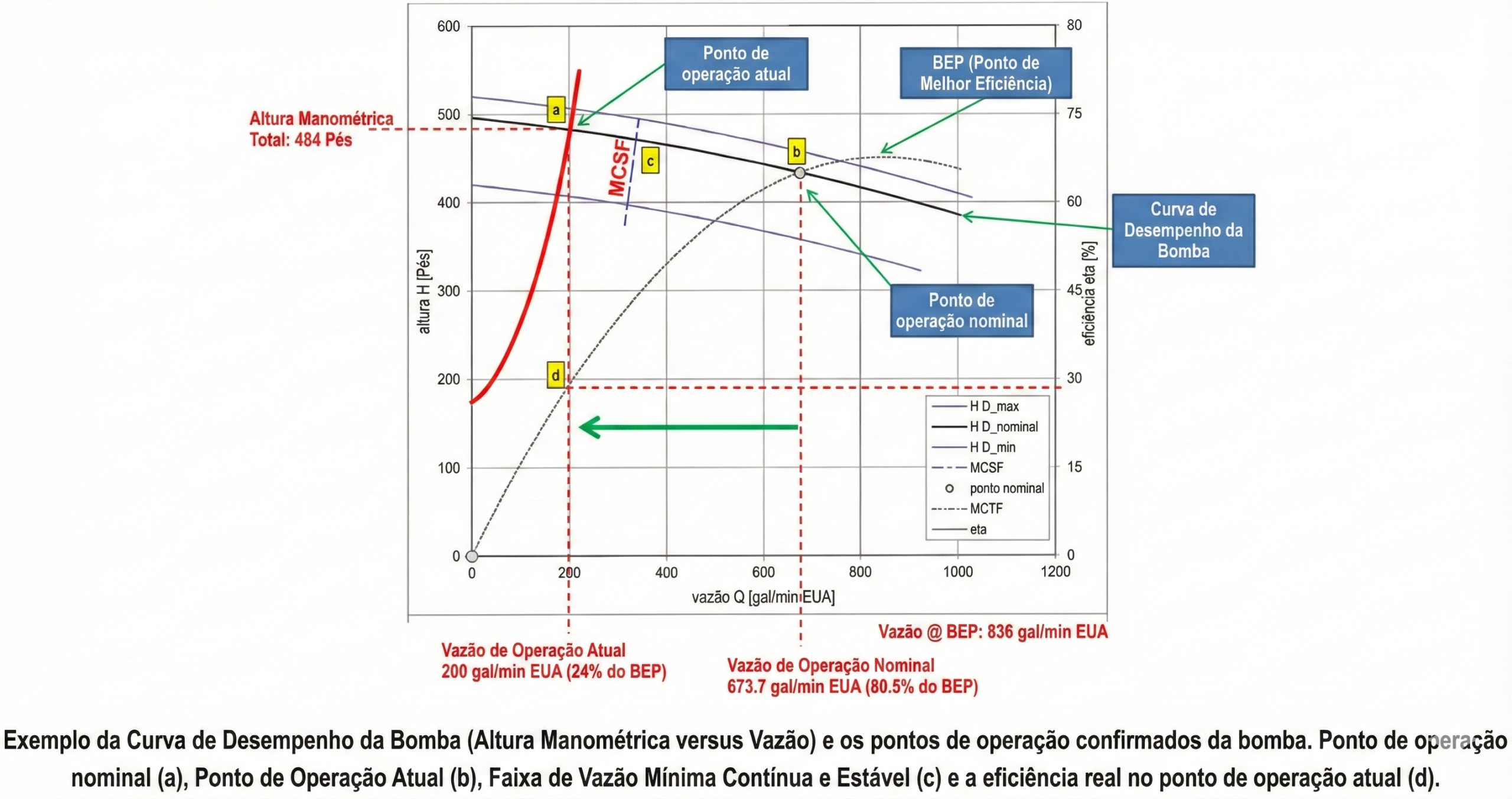 Causa Raiz nº 1: Operação Muito Fora do BEP Os dados mostraram que todas as bombas estavam operando dramaticamente abaixo do seu Ponto de Melhor Eficiência (BEP) — entre 26% e 49% do BEP, com média de apenas 36%. A janela preferida do padrão API 610 é de 70% a 120% do BEP.