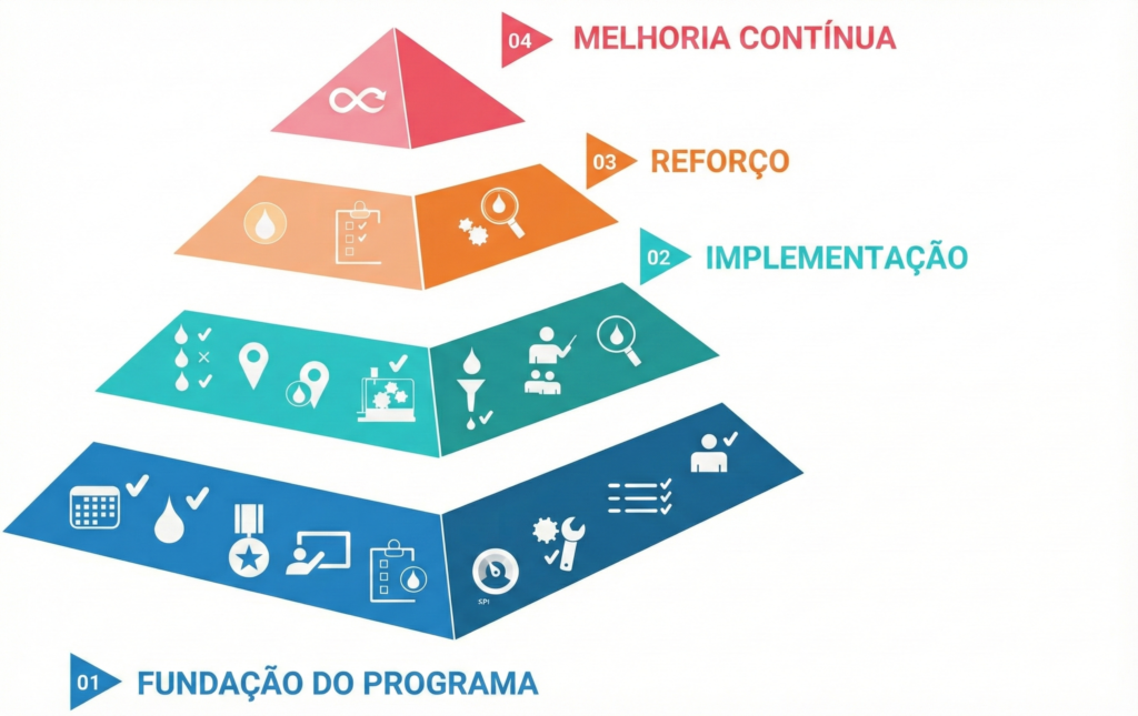 Reconhecer que a fase de Implementação (Passo 2) é um processo que leva um ano é essencial para gerenciar as expectativas e garantir uma integração completa e bem-sucedida do programa de lubrificação.