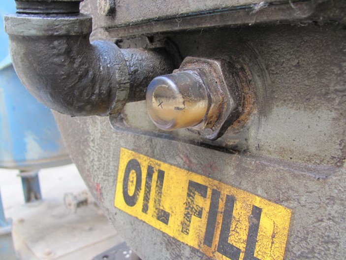 Esse visor de nível consegue detectar espuma? Água emulsificada? Óleo oxidado? O nível correto do óleo? Existe alguma preocupação com as peças da instalação? E a ventilação? Há acúmulo de sujeira (sedimentos) entre a curva do cano e o reservatório? O nível do óleo está mesmo certo?