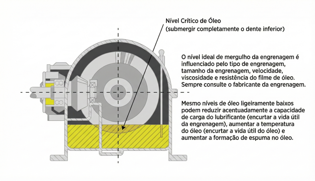 • Nível baixo de óleo causa mais turbulência e mais névoa de óleo. A névoa em caixas de engrenagens e rolamentos é uma das principais causas de consumo desnecessário de óleo. O óleo é perdido para o ar ambiente.