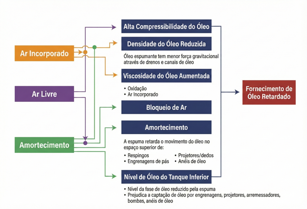 Essa aeração pode agravar ainda mais as condições de falta de óleo (veja o diagrama abaixo). Além disso, o óleo aerado pode induzir cavitação em bombas e rolamentos, bem como verniz causado por micro-diesel (microdieseling), etc.