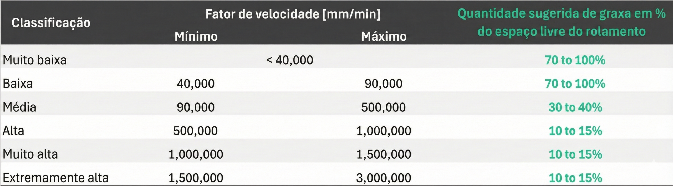 O fator de velocidade também é altamente importante na determinação do volume de preenchimento de graxa. Em geral, quanto maior o fator de velocidade, menor o volume de graxa que deve ser aplicado.
