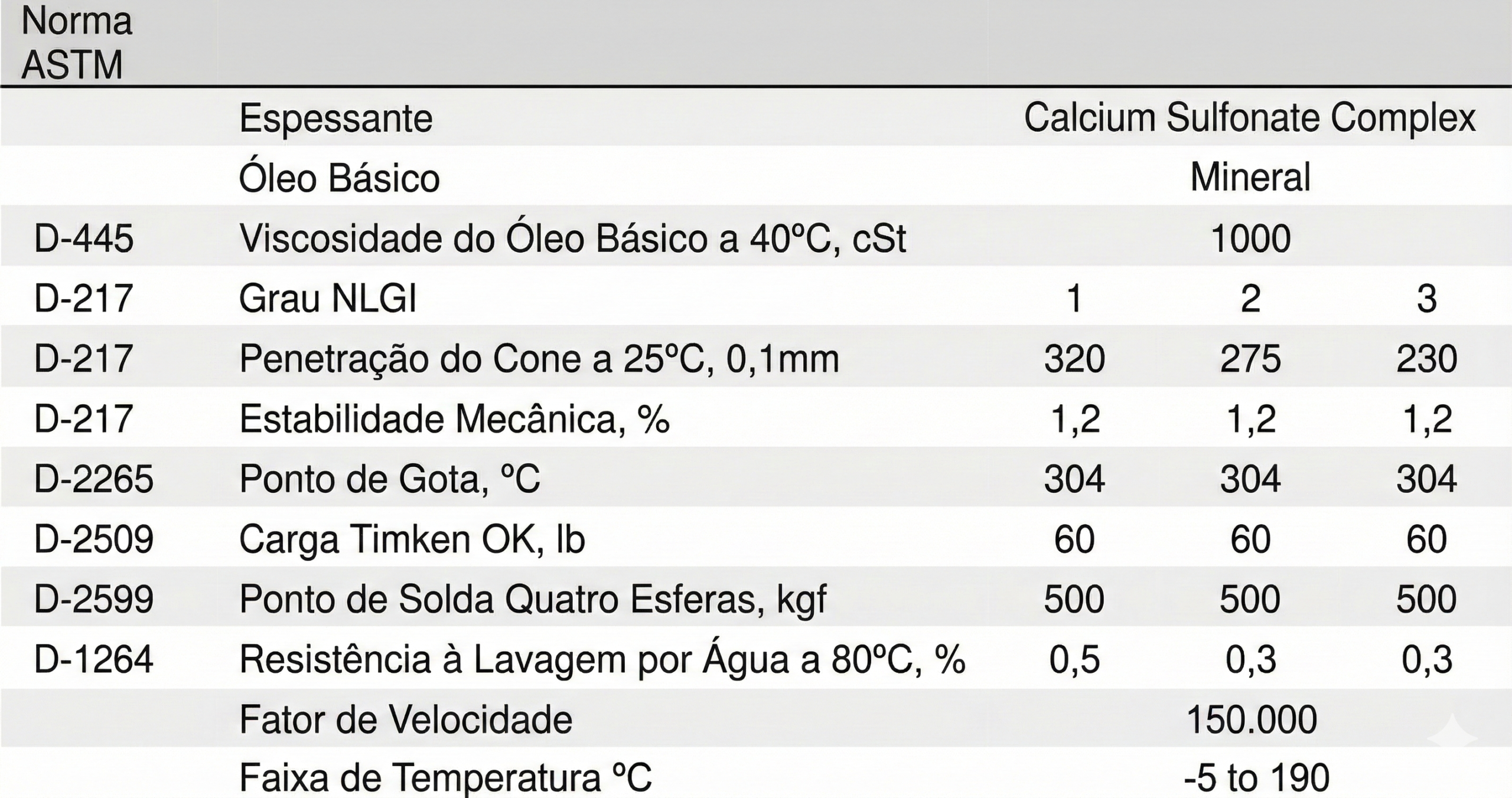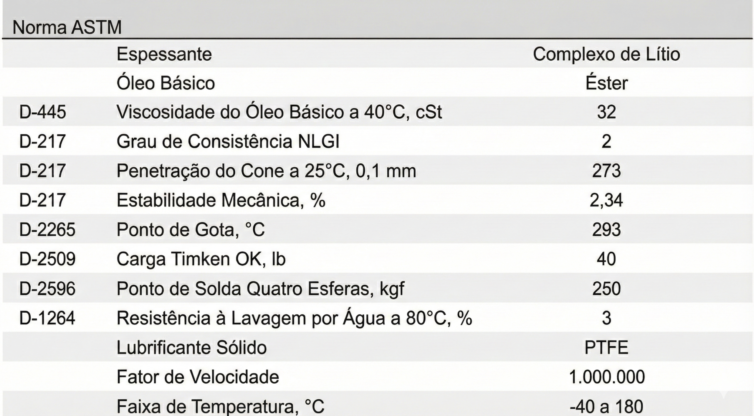 Para mostrar alguns exemplos de fichas técnicas de graxas, nas Figuras 6 e 7 temos, respectivamente, a Interplex, com 1000 cSt de óleo base, espessante de complexo de sulfonato de cálcio e fator de velocidade de 150.000, e a Sintaplex, com um óleo base de 32 cSt, espessante de complexo de lítio e fator de velocidade de 1 milhão.