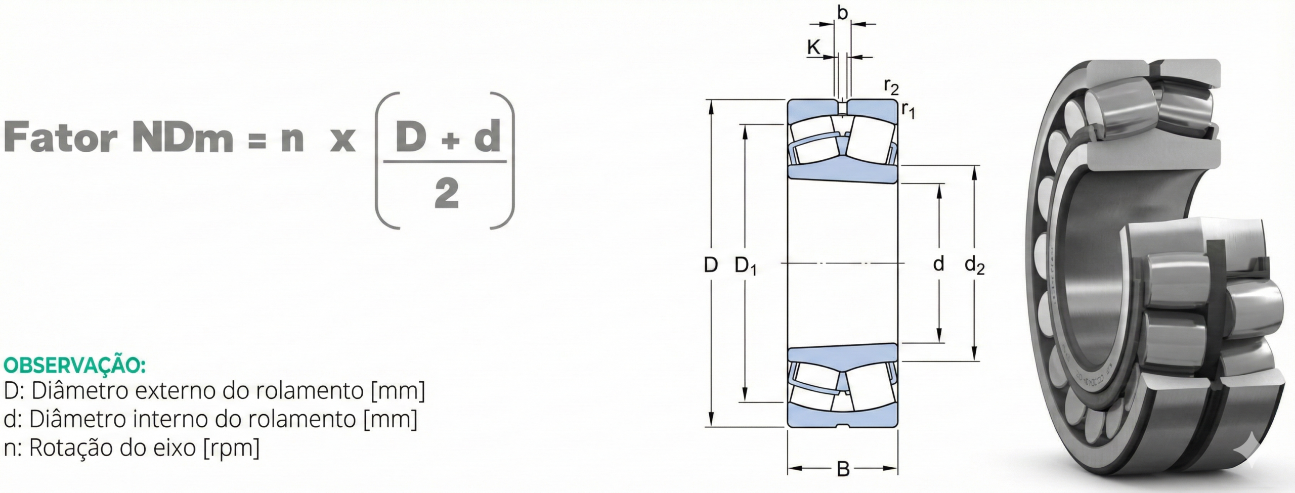 Após essa explicação, chegamos ao cálculo do fator de velocidade, fator NDm ou fator de velocidade — qualquer termo que você prefira. Existe mais de uma maneira usada para calcular esse fator em rolamentos. Para nossos propósitos, apresentaremos o método mais comum, que é baseado no diâmetro médio.