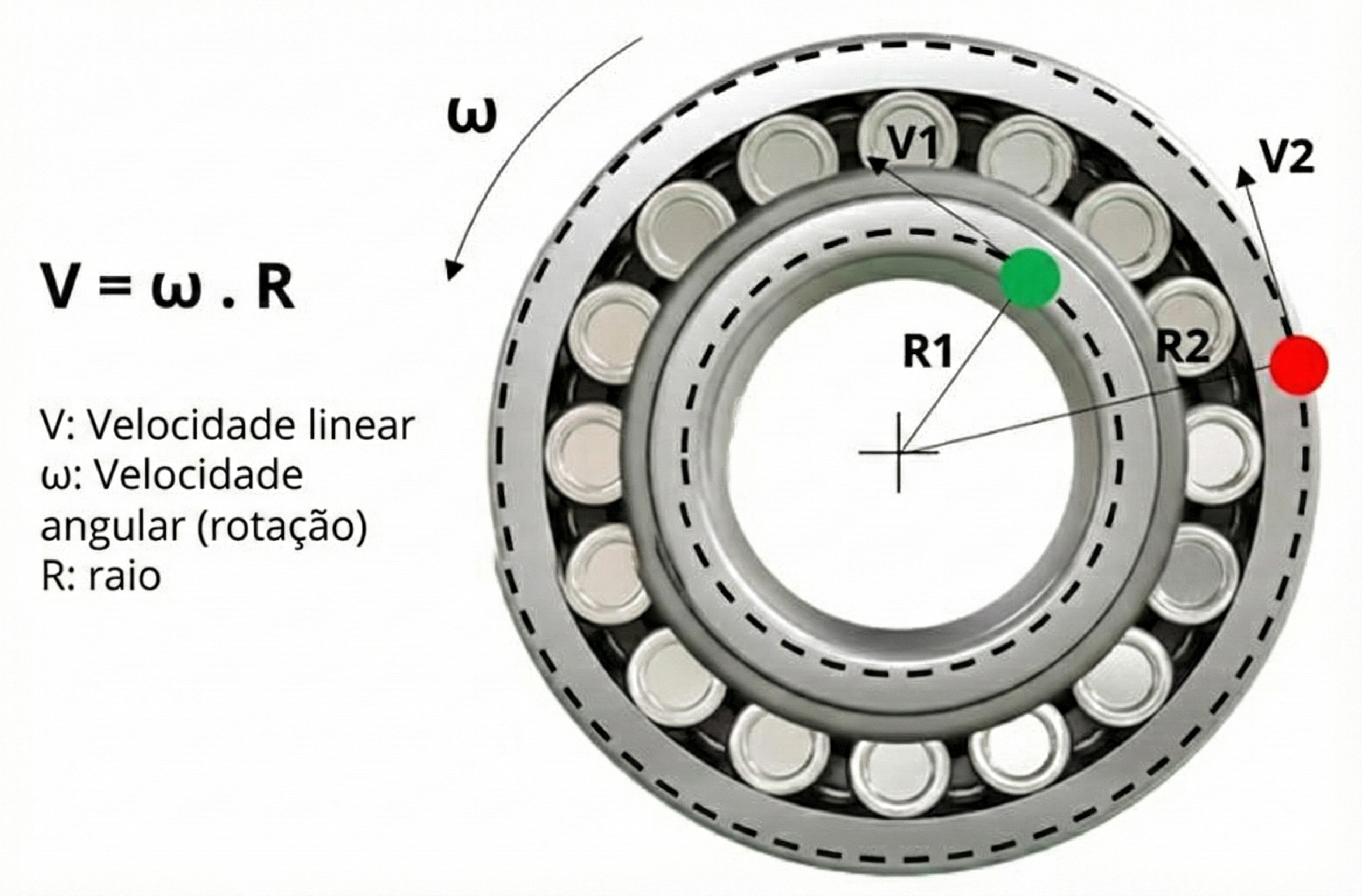 Essa equação nos mostra que, para a mesma rotação (fixando o ω), quanto maior o diâmetro, maior a velocidade linear. De uma forma mais técnica: Se dois pontos percorrem trajetórias concêntricas com a mesma velocidade angular (rotação), então o mais externo deve ter maior velocidade tangencial/linear. Isso significa que rolamentos maiores exibirão velocidade linear mais alta do que rolamentos menores. E isso impactará muito na definição do lubrificante ideal para o rolamento.