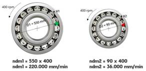Considere dois rolamentos de diâmetros diferentes, mas ambos com a mesma rotação, exemplificada aqui como 400 rpm. Como explicado anteriormente, sabe-se que a velocidade linear de cada um será diferente no ponto onde o lubrificante será colocado. Em outras palavras, a velocidade linear no ponto do diâmetro médio será maior no rolamento com o diâmetro maior.